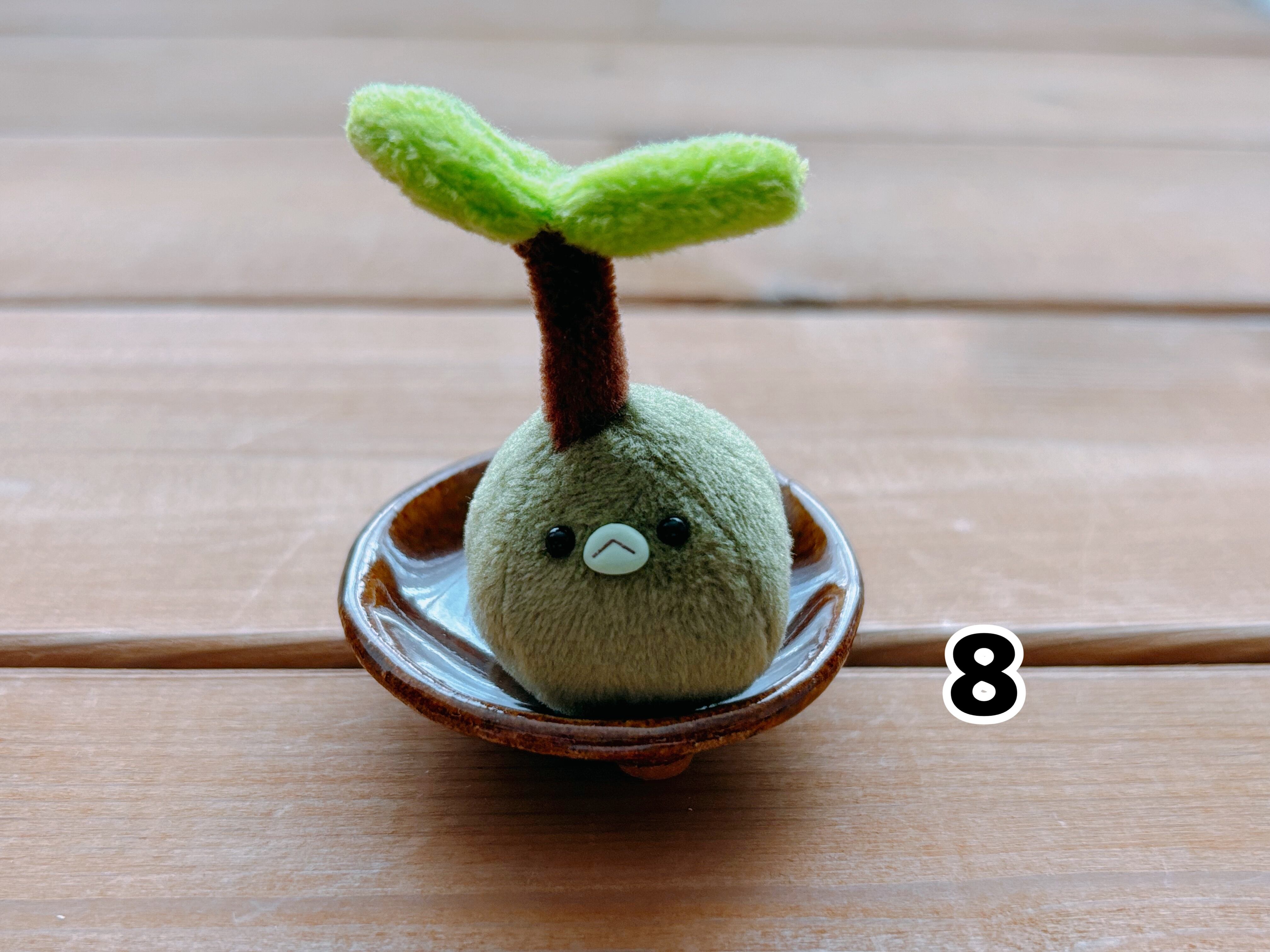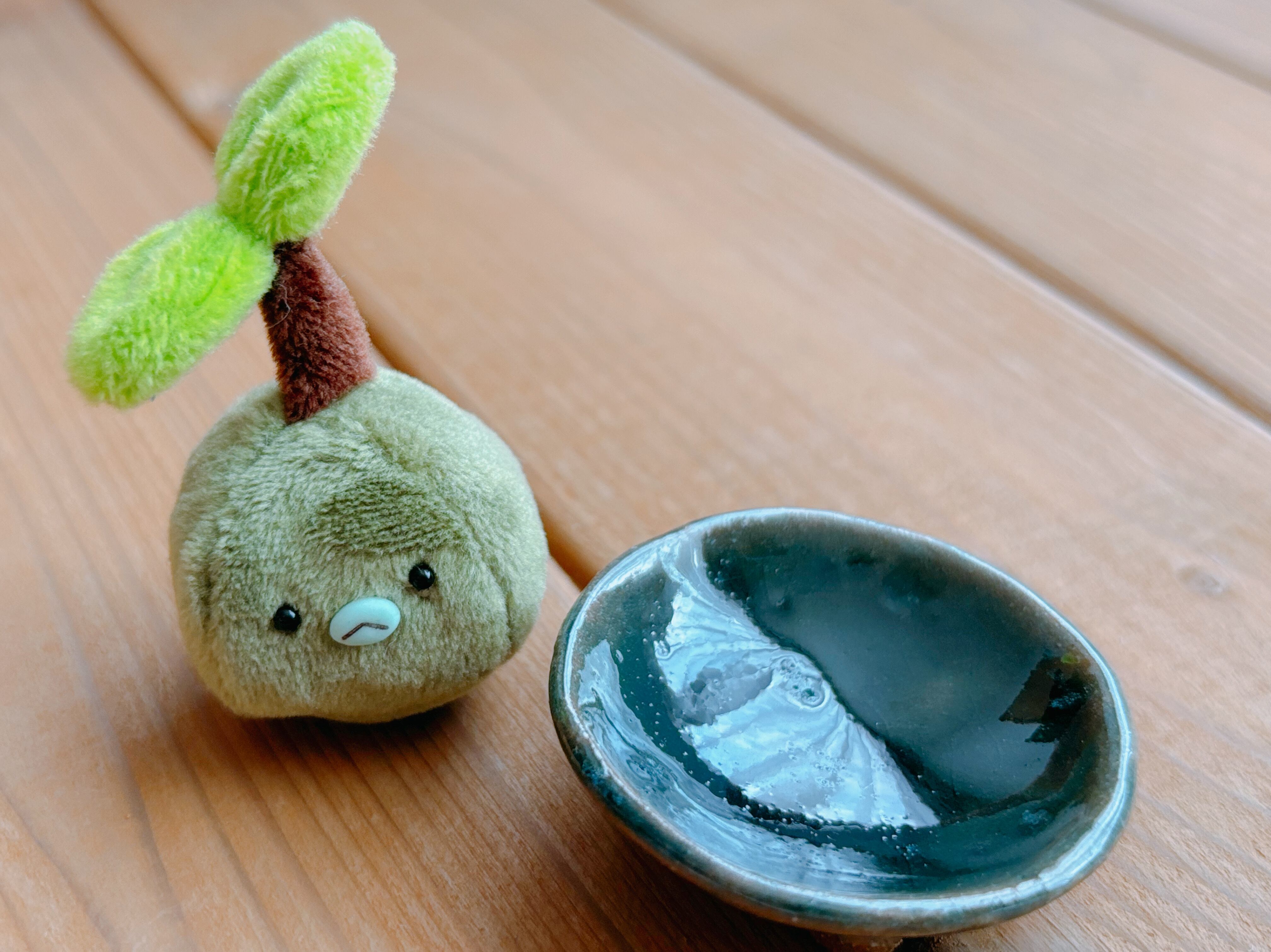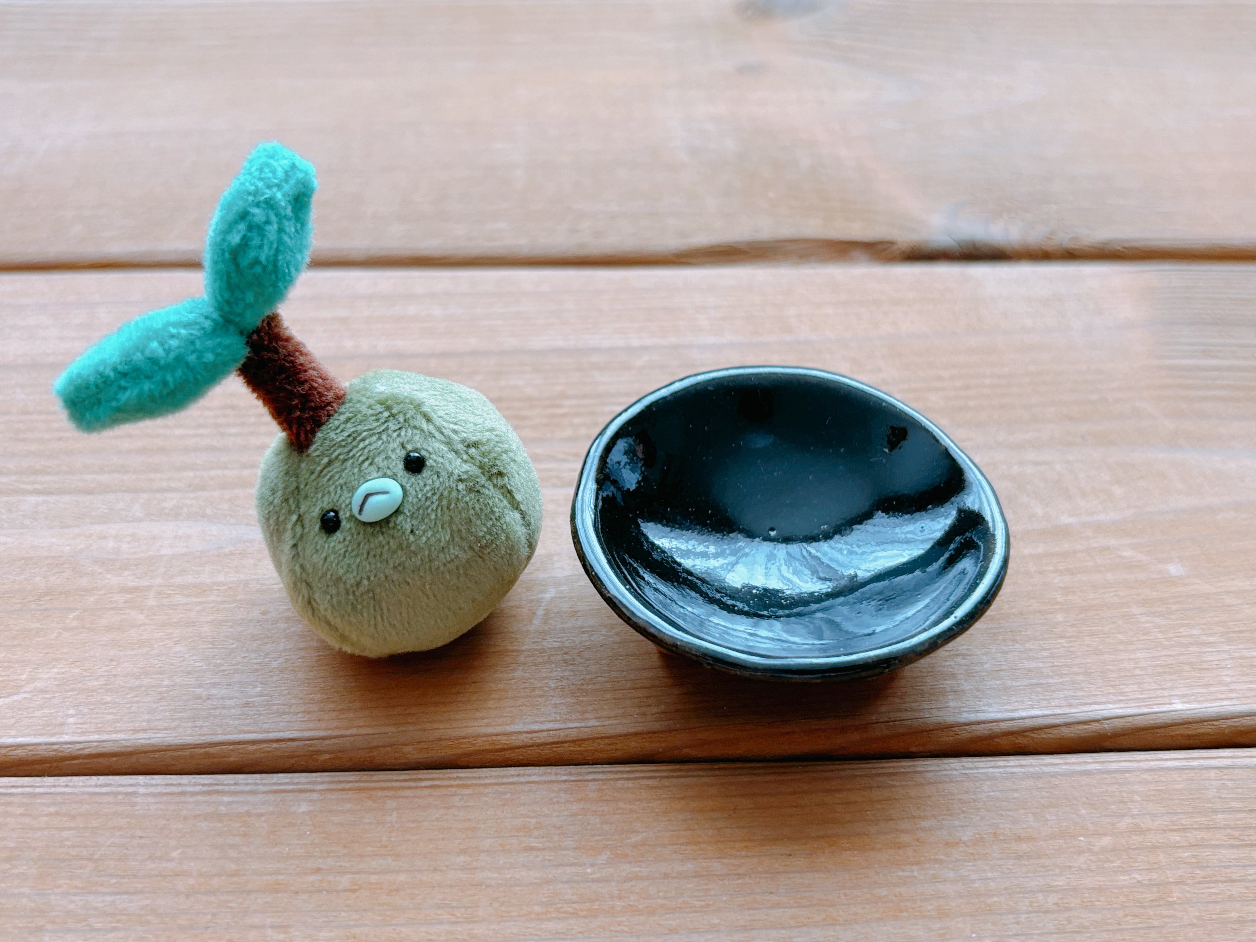 ひとつひとつ粘土から成型し、釉薬をかけて焼成した陶器の受け皿に苔玉を載せました。