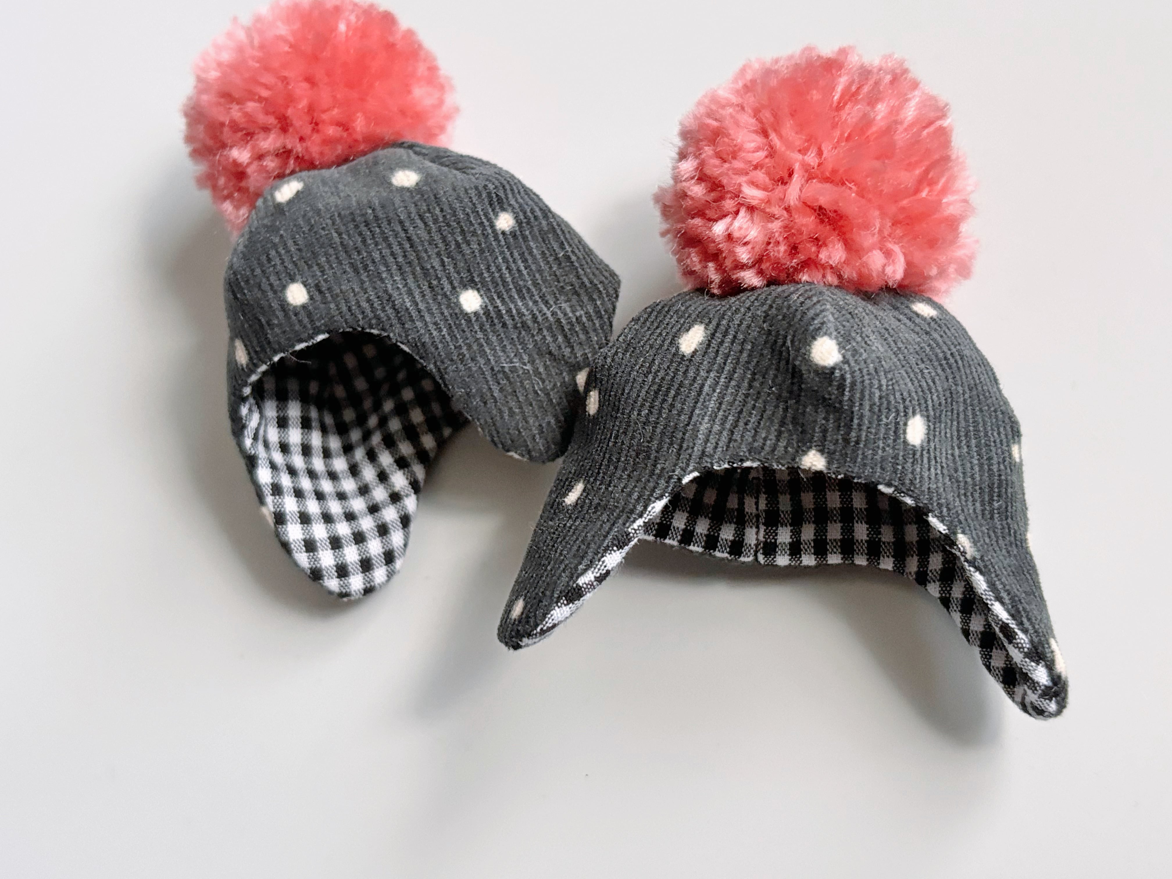 グレー地の細畝コーデュロイ生地とギンガムチェックの綿生地を合わせ、大きめのくすみピンクカラーぽんぽんを付けました。